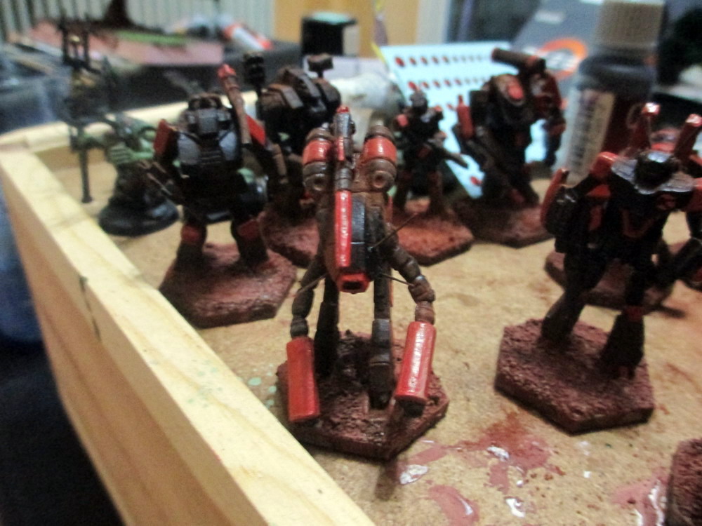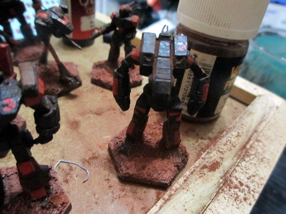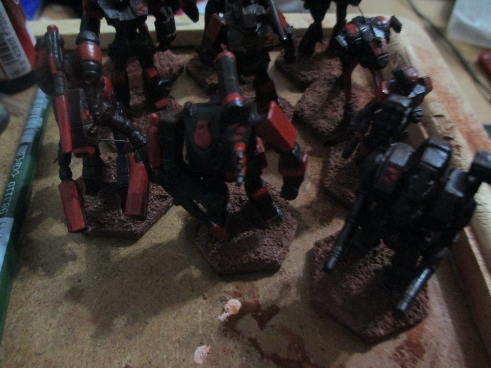 Die Bases sind noch nicht fertig, die werden noch komplett gestalltet. Momentan wollte ich sie nur fest drauf stehen haben. Mit ner guten Ladung sekundenkleber und einem draht, nicht gesteckt sondern gewickelt, sollte die mechs beim bemalen nicht von der Base fallen.