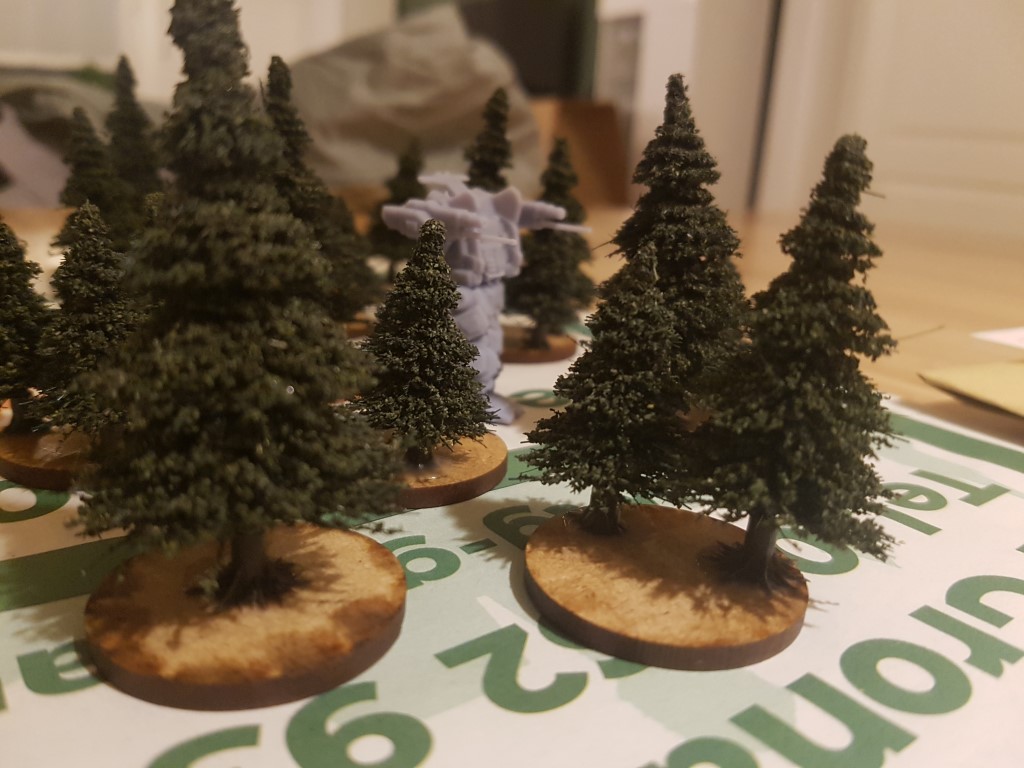 Leicht und schwerer Wald wurden durch Nadelbäume (Leicht) und Laubbäume (Schwer) dargestellt. Genauso gabs auch Bases für Rough und Rubble.