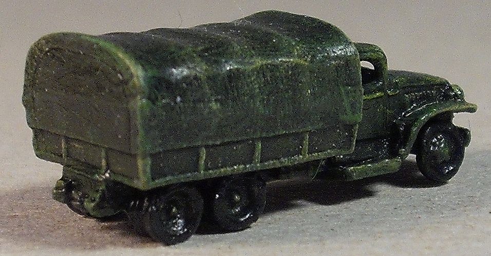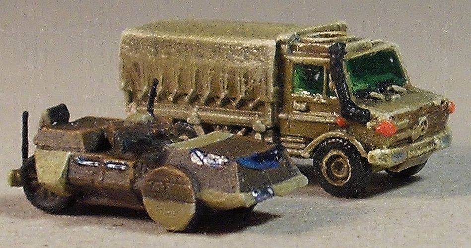 Den Anfang machen mal wieder ein paar Minis, die eigentlich gar nicht Battletech sind. In diesem Fall sind es recht zierliche GHQ Minis (oder aus einer vergleichbaren Linie), also echtes 1:285. Zum einen hätten wir da ein Paar Unimogs, 1300L, einmal als BW Standardolivgrün und einmal in Wüstentarn. Die andere Mini ist ein GMC CCKW, ein LKW aus dem zweiten Weltkrieg. Alle drei hatte ich gekauft um sie als Zielobjekte auf die Platte stellen zu können (z.B. Konvoidarstellung), auch wenn sie dafür schon etwas klein sind; dem Maßstab sei Dank. Allerdings sind sie immer noch spürbar größer als die APC Witze von IWM.