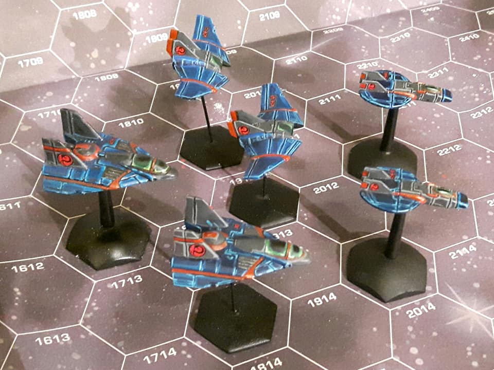 So langsam werden hier mal wieder ein paar Miniaturen fertig. Darunter auch ein Schwung Luft-/Raumjäger für die 2. Nightstalker des Draconis Kombinates.