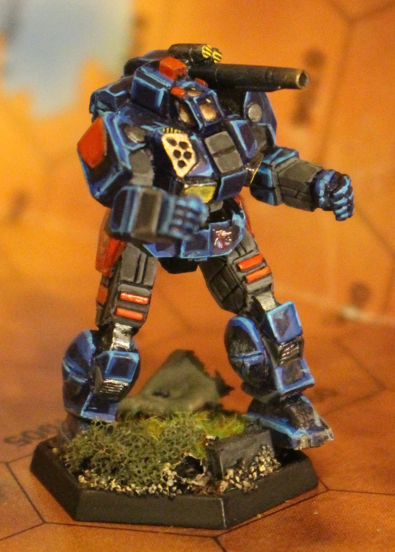 Nett geworden, auch wenn ich meine, dass die blauen Kantenhighlights ein wenig zu deutlich herausgearbeitet wurden. In der Form sieht er aus, als ob der ganze Mech nach einem Schuss der PPK vor lauter statischer Elektrizität nachglüht.