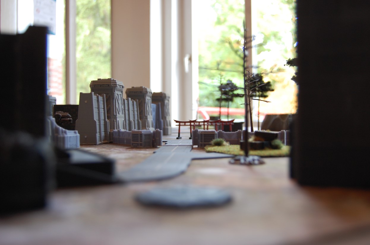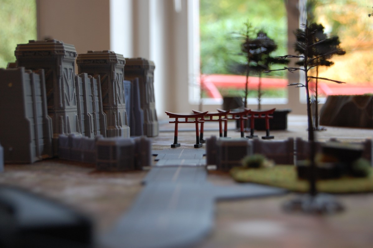 Ebenfalls käuflich erworben sind die vier Torii-Gates in der Mitte. Diese bestehen aus Cardboard (vergleichbar mit dickeren Druckerpapier und dünneren Karton) und kommen aus den USA.