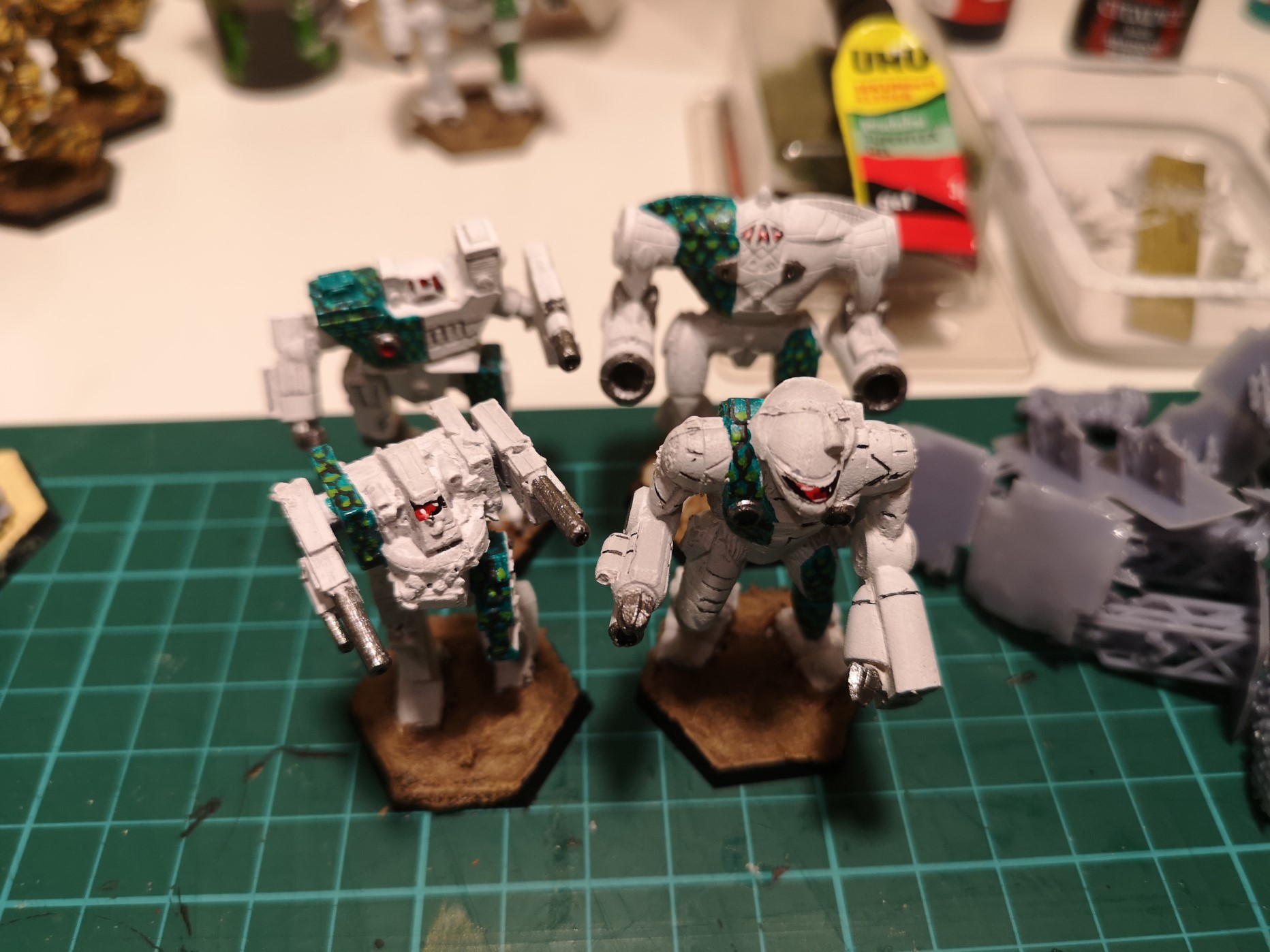Die vier Mechs im Anhang sind fertig und gehören zu einer Kompanie eines Freundes. Es ist das 1st Ghost Regiment aus dem Drakonis Kombinat. Ich hatte die Miniaturen schon einmal zur Bemalung auf dem Tisch und wollte daran etwas testen. Leider weiß ich nicht mehr was aber es führte dazu, dass die Oberfläche hier und da nicht mehr so eben war. Das sieht man leider auch bei den Minis.