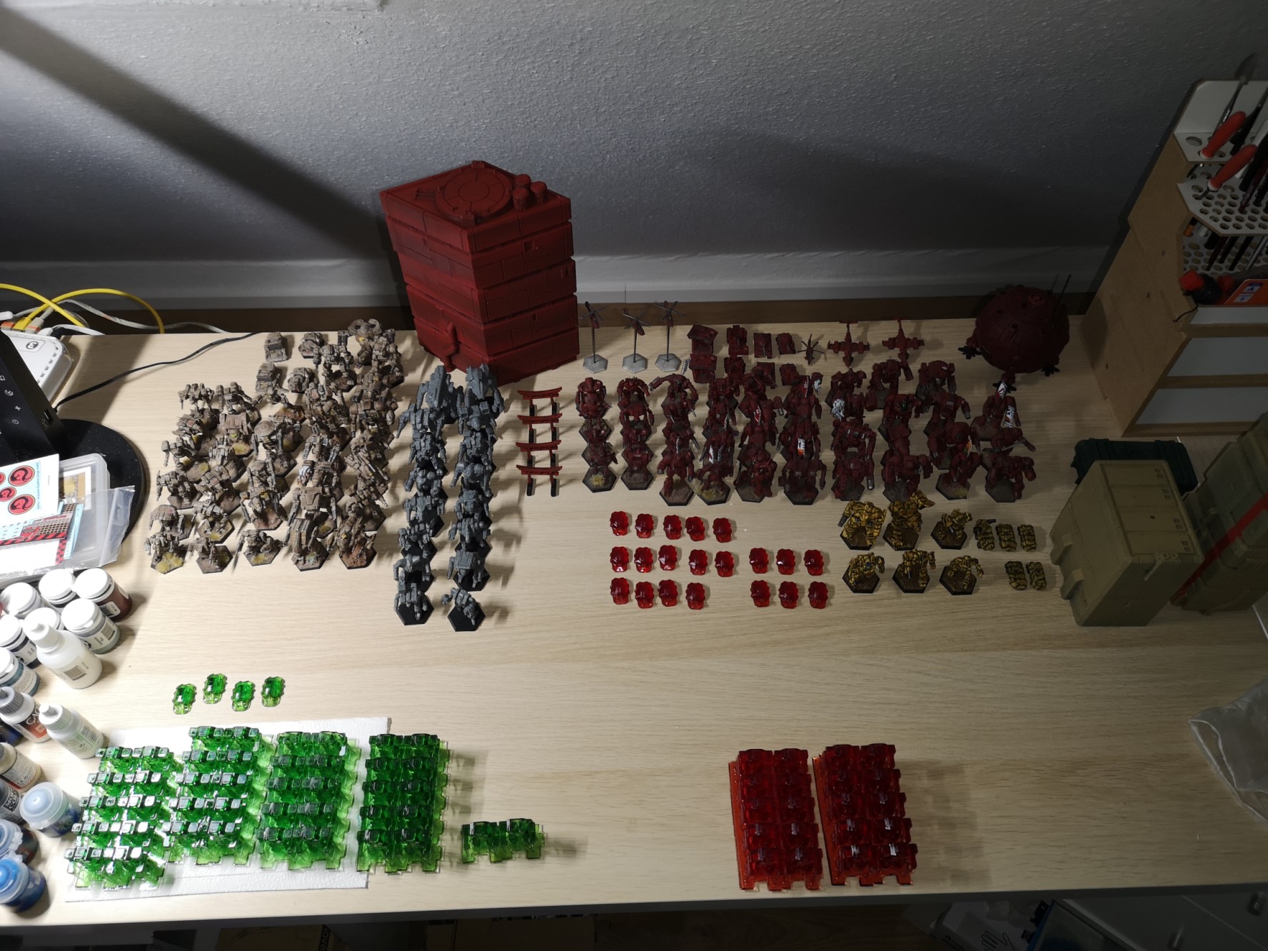 Die grünen und roten "Gummimechs" hatte ich im Inet heruntergeladen und in entsprechendem Resin gedruckt. Sie sollen die Radarblips zu Begin des Spiels darstellen. Aktuell werden die Blips noch von der Stützstruktur befreit und auf durchsichtige Acryl-Hexbases geklebt.