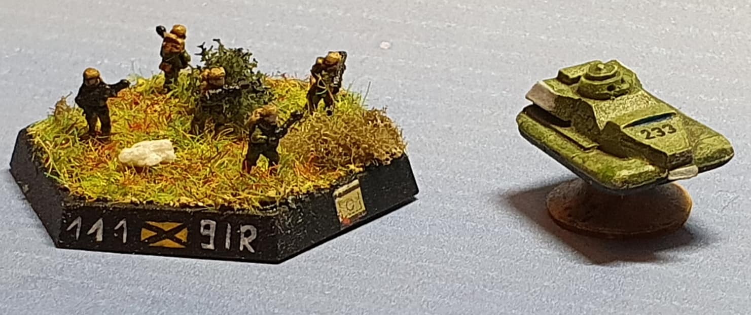Auch ein Grund, warum die bei mir auf einer Base stehen. Das mache ich sonst bei Fahrzeugen ja nicht. In dem Fall natürlich aus zwei Gründen. Zum einen, um die Einheit als mechanisierte Infanterie darzustellen. Zum anderen aber auch, um den Fingern einen anderen Ansatz als das MG zu bieten, wenn man den Counter bewegen will.