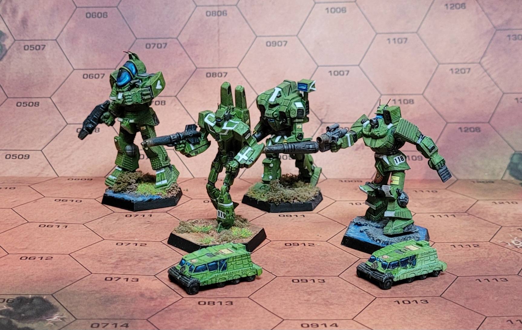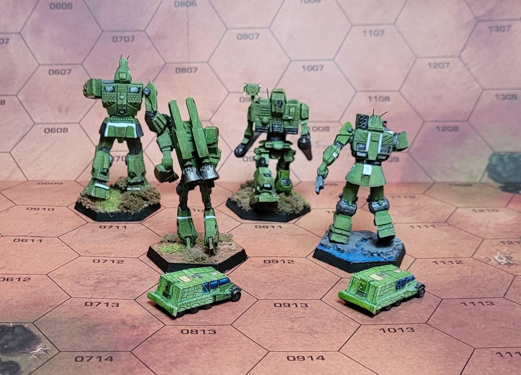 Phoenix Hawk und - der einzige stilistische Ausreißer in dieser Gruppe - ein Vindicator Beutemech.